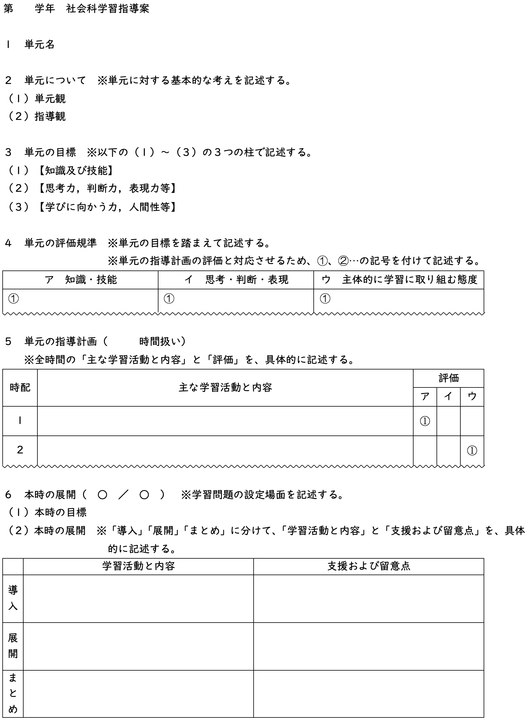・任意の単元を選択して、以下の様式で、小学校社会科の学習指導案を作成しましょう。