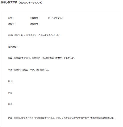 「自分で考えてみよう」から指定の各章1題を選択し、解答は小論文形式で提出。(小論文の形はこちらを参照。)