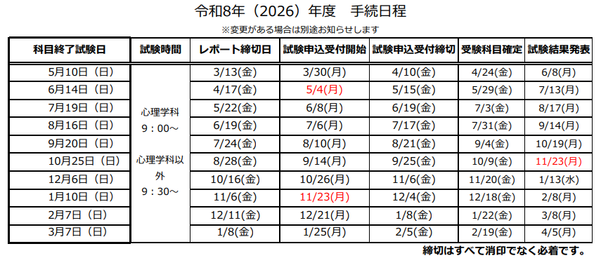 ※ 令和8年度入学生の第1回科目終了試験は、春学期(4月)入学生は6月14日(日)、秋学期(10月)入学生は12月6日(日)からとなります。
